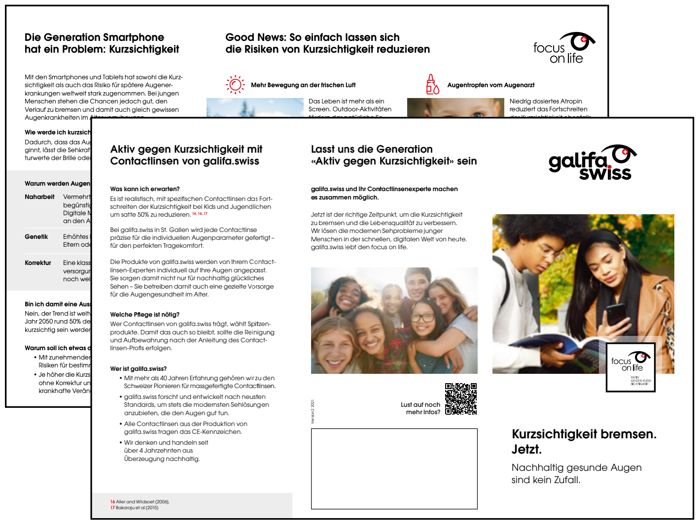 Für den Endkunden stellen wir Ihnen einen A5 gefalzten Flyer zur Verfügung. Falls den Eltern die Informationen auf dem Flyer nicht genügen sollten, können sie sich via Barcode auf unserer Website im Detail über die Kurzsichtigkeit informieren.