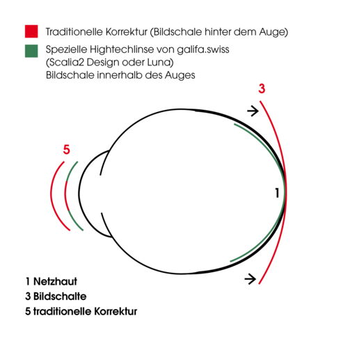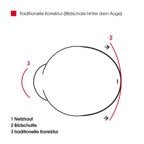 Schaut man sich allerdings die Peripherie an, tritt hier der sogenannte Bildschalenfehler in Erscheinung. Dort wird das Bild nicht auf der Netzhaut abgebildet, sondern dahinter. Das lässt sich mit traditionellen Brillengläsern und Contactlinsen leider nicht vermeiden, da die Bildschale der Sehkorrekutur anders geformt ist als der Augapfel.