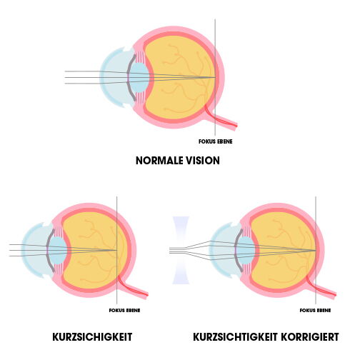 Bei der Längenmyopie ist der Augapfel zu lang. Das bedeutet, dass die Lichtstrahlen vor der Netzhaut abgebildet werden und nicht, wie es bei einem rechtsichtigen Auge der Fall ist, auf der Netzhaut. Mit einer traditionellen Brillen- oder Contactlinsekorrektur wird erreicht, dass dieses Lichtbündel weiter nach hinten auf die Netzhaut verschoben wird . So entsteht im Zentrum der Netzhaut ein klares Bild.